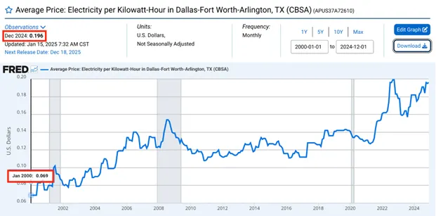 The cost of energy in North Texas has increased 184% in the last 25 years, thats an average of 7.36% per year.